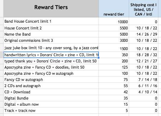 My stretch goals were to budget for strings/horns/backup singers on the album, plus some music videos. All of these were already in my ideal project budget, but optional.