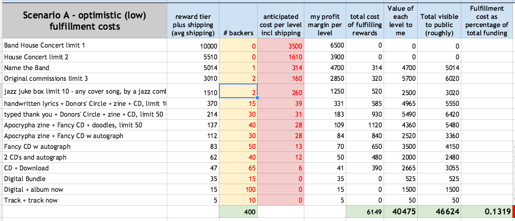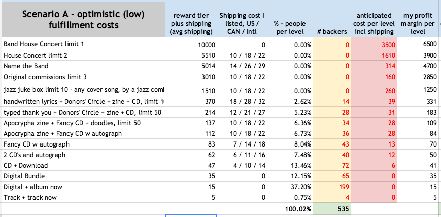 I can say this with confidence because almost everyone’s rewards are underpriced. Especially CD’s and DVD’s. You can’t sell a CD during a Kickstarter for the same amount as in the store (if there were still any stores that carried CD’s). Let’s do some spreadsheet action on our reward levels.