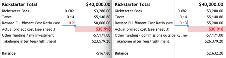 We plug that fc/tf ratio back into your overall Kickstarter funding plan, just like taxes and Kickstarter fees (the highlighted cells below). You can see the difference between a .13 and a .20 fc/tf ratio: