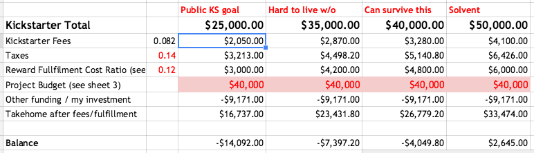 In the end I’m not totally confident I *can* raise $30k, if something goes wrong or I fail to get momentum. I decide $25,000 is my public Kickstarter goal — that’s my minimum confidence goal. If I only earn $25k, leaving me a balance of -$8010, I have a plan. I will do a spring fundraiser on a smaller scale, I know roughly how much I can raise with that, though it’s tons of extra work. And I will scrimp and save and fight and make the record right.