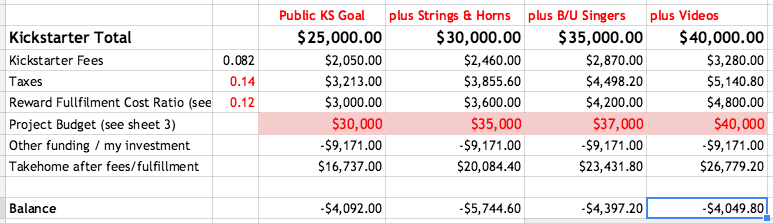 So if I need $40,000 to make the record — but a bunch of that money goes to taxes, shipping, Kickstarter fees, and rewards — how much exactly do I have to raise to hit my budget?